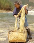 | 白楮晒(川晒し) 厳寒の吉野川で、白楮を何度も水洗いします。 寒さの厳しい冬が、良質の和紙ができる最適期になります。 |