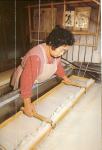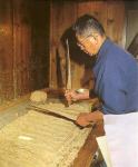 | 紙漉き(かみすき) 漉槽の中に原料、木糊の液を加えよく混ぜてから、桁ですくって縦横にゆらし、一枚一枚漉きます。 スダレの上に、手際よく漉き上げられてられていきます。 |