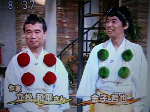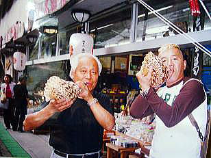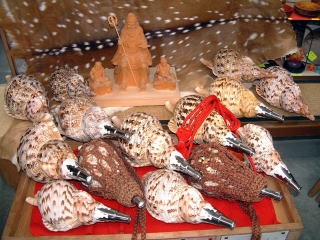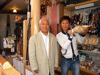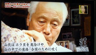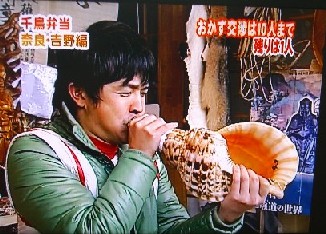 2005年9月28日 8時30分〜9時20分 「NHK生活ほっとモーニング」 「こだわり旅 立松和平が吉野・修験道に挑戦」 太田桜花堂で、法螺貝の吹き方を練習して 大峯山に入られました。 東京のNHKスタジオでの、修験道の衣装や、 法螺貝は、当店からの貸し出しです。 |