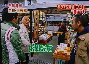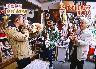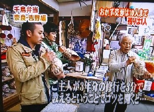 | トミーズ雅さんメインの番組で、千鳥太悟さんと千鳥ノブさんが、吉野に来られました。太悟さんは、法螺貝がなりました。 | お弁当のおかずは、食事の支度には中途半端な夕方4時頃、突然入って来られたので、残念ながらありませんでした。(すみません) 番組が終わってから、デザートに柿でもさし上げれば良かったと思いました。 |