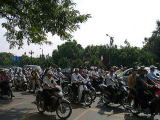 2005年7月15日(Fri) 主人の仕事の都合で、HANOI ハノイに1年4ヶ月住むことになりました。 ハノイに第一印象は、「なんと騒々しい国だろう」と思いました。 バイク・バイク・バイク・バイク・バイク・・・・・・ 交通手段として、バイクを利用する人が多く、信号が余りありません。したがって道路の横断は、走らず、歩いてバイクの間を、通り抜けます。この時、走ってはいけません。同じスピードで歩き、近づいて来るバイクが、歩行者の動きを予測できるようにして、バイクが道路を横断中の歩行者を避られるようにします。少しオーバーですが、命がけです。車は右ハンドルのため、左折がかなり難しく、よく、あれで事故を起こさないなあと関心します。赤信号でも右折は止まる必要がありません。 バイクも車も時速30Kmほどであまりスピードは出してしませんが、めったやたらとクラクションを鳴らしますので、かなり騒がしい道路状況です。舗装も悪く、少し幹線道路から離れると埃っぽいので、マスクがいるくらいです。 |