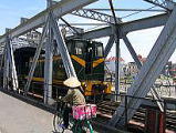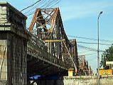 2005年8月20日(Sat) ロンビエン橋です。ハノイ旧市街の北側にあり、ホン河にかかる約1700mの鉄橋です。パリのエッフェル塔を設計したエッフェルにより設計されたものですが、ベトナム戦争時、補給路を断つ意味でアメリカ軍の攻撃を受け、少し壊れています。単線の鉄道が通ります。時速20Kmほどでゆっくり走ります。初めて線路の上をジーゼル車が通るのを見ました。その横に、歩道(バイク・自転車通行可)でした。かなり老朽化しています。ベトナム戦争の後がこんな所に残っています。 |