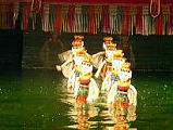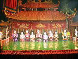水上人形劇(ウオーター・パペットリー)を見ました。水面を舞台にして、繰り広げられる人形劇です。一つの話が、3分〜5分で、17話ありました。ベトナムの伝統的な楽器が演奏されコミカルです。言葉は分からなくても、十分楽しめました。人形が良く出来ています。最後に、人形を操っていた10名ほどの方が、出て来られましたが、腰まで水に浸かって動かしておられるようです。 | ![]() |