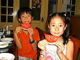 2005年8月24日(Wed) Kさん、Yさん、Oさんと、韓国料理屋さんで、石ビビンパを食べました。とてもおいしかったです。白菜キムチは小芋の煮物など、沢山、前菜がついていました。子供たちが注文したラーメンは、少し辛かったです。デザートに出てきたスイカは、持ちやすいように、かわいく切っていたので、写真にとりました。こちらのスイカは、日本とは違ってラグビーボールのような形をしています。スイカより、かわいいのが、一緒に食べに行った、よそのお子さんです。子供たちのほうが、違う環境に慣れるのが、早いのでしょうね。 |