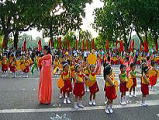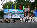 ホアンキエム湖のところで、沢山の人が集まって、道路を通行止めにして、イベントをしていました。ベトナム国旗を先頭に、ホーチミンさんの肖像画が入場し、軍隊、各地区のプラカードを先頭に入場行進に始まり、聖火の点燈、その後、各団体のパフォーマンスがありました。警察官の体操、婦人会の人たちのダンス、幼稚園のお遊戯、少林寺のわざ、小学生のダンスなど、暇だったので、2時間ほど、ズーと見ていました。 後で気がついたんですが、9月2日の建国記念日に、ここで行われるフェスティバルの予行演習だったようです。 ![]() ホーチミンさんの肖像画です。かわいい幼稚園児です。 |