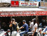 2005年8月30日(Tue) 前に、和歌山からお一人で旅行に来られたかたから、日本では 朝日放送で「恋するベトナム」と言う番組があり、亡くなったお兄さん恋人を探して、ベトナムを縦断するドラマの話をお聞きしました。こちらでは、見ることが出来ないのが残念です。先日その方から、そのドラマで、「ブンチャー」で有名な「ダックキム」お店も、出ていたとメールをいただきました。以前から、一度行きたいと思っていました。素麺のようなもの(米粉でできています)を、ぬるい漬け汁につけて食べます。漬け汁の中に、豚肉の焼いたのや、ハンバーグを紫蘇で巻いてあげたようなものや、青パパイヤが入っています。それに、バジルやミントなどの野菜がてんこもりきます。とても美味しかったです。ナムザンという上げ春巻きも一緒に注文しました。これも美味しかったです。日本人にとても受けると思います。お昼時だったので、満席でした。 |