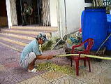 2005年9月3日(Sat) 朝、海岸沿いを散歩していて見つけた光景。 サトウキビの皮を剥いています。50cmぐらいに切って、サトウキビジュース(ヌックミア)にします。 ザボンを天秤棒で担いで売っていたおばさん。 ちょっと水分が足りないけれど、まずまずおいしい |