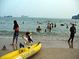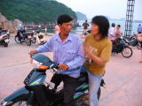 お昼は、暑さと疲れで少しバテ気味だったので、まずお昼寝をして、体力を充電し、1,5Kmのところにある。カットバビーチに夕方、泳ぎに(つかりに)行きました。 ここは、バスやタクシーがなく、個人での移動手段は、モーターバイクだけです。場所も不確かだし、疲れていたので、モーターバイク初体験です。交通量は少なく、スピードも時速20kmほどで走りますので、ハノイのように危険ではありませんでした。でも、乗る前に、まずは値段交渉からです。 |
