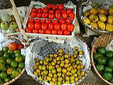 2005年9月7日(Wed) 暑いながらも、一時期よりは少し涼しくなりました。市場に行くと、柿が出ていました。「秋が来たのかな。」と郷愁に誘われます。 その柿は、トマトのように赤く、美味しそうです。(写真上) Kさんが、「日本の柿をイメージして買うとショックがあるよ。食感は、やわらかく、美味しくないよ」と言われましたが、やはり、食べてみないことには分からないと思い、買ってみました。やはり忠告を聞いて、買わなければ良かったと後悔するような味でした。渋い! 日本の渋柿とも違う味です。そのままではなく、何か食べ方があったのでしょうか。 手前は、直径3cmほどの柿です。日本のものに良く似ています。 ☆だめもとで、渋い柿のへたの部分を焼酎に漬けてみました。日本の合わし柿のように、渋みが取れて美味しくなっていました。さらにやわらかくなっていましたが・・・ |