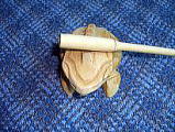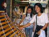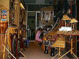 ベトナムの楽器屋さん (ホアンキエム旧市街に楽器屋さん通りがあります。) いろいろなベトナムの楽器が置いてあります。 人形水上劇のとき、舞台の袖で演奏していた 一弦琴もありました。日本の笙(しょう)に似たKhen Be 、太鼓、どら、それから 竹製の打楽器でT'rung(トゥルン)もありました。まろやかな木琴のような音で、親指と中指で挟んだ撥の両側を楽器に当て、手首を細かく振るように動かしてトレモロのように音を出します。 私が買ったのは、木製の蛙 Mo coc で、蛙の背中が細かい山になっていて、そこを木製の撥でなでると、まるで蛙が鳴いているように聞こえます。これも楽器と言っていいのでようか。 |