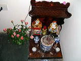 2005年9月20日(Tue) 商店の店先の床に、箱型の「バートン」がよく置かれています。この中には、頭巾をかぶり微笑んで太鼓腹で日本の大黒様に似た「土地」と言われる神様と白髪の「財神」が祭られています。どこのお店のバートンも、大切にされているのが良く分かります。いつも供物が供えてあってベトナム人にとっては、大切な神様です。 ベトナムのことわざに「土地の口は、財神を導く」と言うのがあるそうです。 |