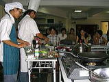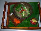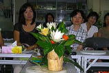 2005年9月23(Fri) JVCC(Vietnam-Japan Human Resources Cooperation Center ベトナム日本人材協力センター)主催のお料理教室に参加しました。 JVCCは、日本とベトナムの相互理解を促進する目的で、日越両国政府の合意のもと、JICA(独立行政法人国際協力機構)が2002年に設立したようです。 今回は、「ベトナム料理を作ってみよう 33回」でした。 @フォー ボー(牛の米麺) A干し牛肉と春雨サラダ B蓮の実おもち の3品です。どれも、ベトナムを代表するお料理で、ベトナムの素材を使ったものです。 たとえば、「干し牛肉(見た目は、肉の塊が少しいんでいるような。でも、腐ってもいない)」 「干しねぎ(たまねぎの小さいの、中まで茶色い」)」 「ヌックマム(醤油に似た調味料)」 「タォー(香辛料)」などを使います。 驚いたこと、@レシピの分量表の「大さじ」は、「おたま」でした。 Aいためる油は、日本よりはるかに多く入れ、揚げる油は、日本より、はるかに少ない油で揚げます。 最後に、マンゴーや、きゅうりを使って綺麗な蓮の花を作りました。ナイフを持ってお花作りに挑戦してみましたが、不器用な私のは、お見せできないほど、「ぶさいく」になりました。(左の写真は先生が作られた蓮の花です。)本当のお花のようにきれいでした。 |