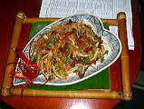 2005年9月15日(Thu) Com Vong(コムボン) まだ、稲が青いうちに刈り取り、蒸して搗いて、籾殻をとります。そしてLa com xoi(おこわの葉)と呼ばれる葉の汁をその上にふり巻いて、鮮やかな緑色に染めるそうです。ハノイの秋、しかも9月だけの食べ物です。バナナにつけて食べます。 Oさんが、バナナとコムボンと一緒に持ってきてくれて、説明してくれました。コムは、かみしめていると香ばしい香りが広がります。 チンコンソン(ベトナムの人なら、誰でも知っている人です)作詞作曲で「ハノイの秋」という曲がり、ハノイの人が、コムを待つ特別な気持ちが歌われています。 “ハノイの秋、ハノイの秋 ミルク花の季節、まちまちに花の香りがただよう 緑のコムの季節、君の手にもコムの香り 通りかかった僕の足を引きつける瑞々しいコムの香り” |