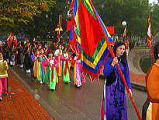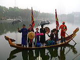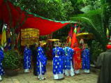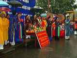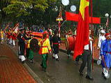 2006年3月5日(Sun) 朝食が終わったころ、遠くで太鼓の音がします。「お祭り?」 じっとしていられなくなり、急いで、身支度をしてカメラを持ち、小雨の降る中、音のするほうへと急ぎました。行列を見付けて後についていくと、すぐ近くのゴックカイン湖 HO NGOC KHANH にある お寺 DINH LANG NGOC KHANH の前で止まりました。その前に横断幕が張ってあり、セレモニーが始まりました。 横断幕には、LE DON BANG CONG NHAN DI TICH LICH SU VAN HOA と書かれていました。この お寺のお祭りのようでした。音楽を奉納した後、表彰みたいのをし、その後、湖を一周して終わりました。 ちゃんとお寺もお参りしました。 |