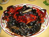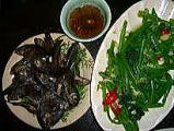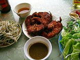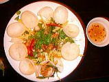 2006年3月12日(Sun) シーフードを食べようと、ローカルのシーフードレストラン Thuy Sinh トゥイシン へバスに乗り、出かけました。 写真は、Cua rang me クア ザンメー と言い、カニをタマリンドで炒めた甘酸っぱさが美味しい料理です。大きなカニ一匹で 180,000VND (1,500円)程です。これは是非お試しください。 |