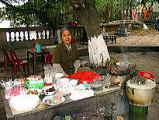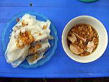 境内の屋台で Banh cuon cha 。プルンプルンしたのを、わしづかみにし、もう一度、横の蒸し器(練炭火鉢)に入れ、温めなおしてくれました。オバサンのその手は大丈夫(清潔)ですか? 私は3時間後、下痢をしました。 | ![]() |