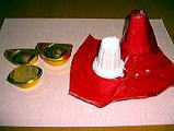 K2さんにゴルフの帰り自宅まで送ってもらって、我が家に初めてご招待。(と言ってもお茶だけ)。 K2さんとは、3月9日のハノイ歴史研究会でもご一緒させていただいていて、「テトの時、お寺でこんなもの頂いたのですよ」とお見せしました。 K2さんは、「これ何ですか」金色の帽子の形をしたものを手に取り、開けて中の塊を指差していたのです。帽子の模様と思っていた筋が、そこから開くようになっていて、中にゼリーが入っていたのです。 私は、街中でよく見かける(通称ハッピーブッダと呼ばれている)布袋さんのような置物が、両手を挙げてこれと同じ物を捧げ持っているので、置き物とばかり思っていたのです。 そして、もう一つの円錐型の方の赤いセロハンをとると中がラクガンのようなものでした。ずっと蝋燭だと思ってセロハンもとらず飾っていました。 なんと言う思い込み・・・・。恐る恐る食べてみました。 |